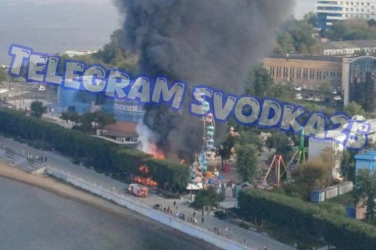 Мощный пожар охватил кафе возле парка аттракционов на Спортивной набережнойГустые клубы дыма видно даже из других районов